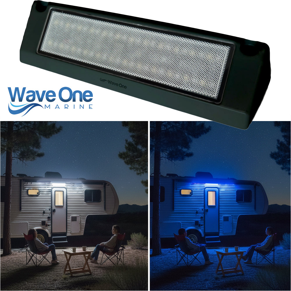 Our Wave One Marine dual color RV trailer LED angle light was designed through years of owning hundreds of boats & RV's that needed a better angle light at a reasonable price. We designed this light with all stainless hardware that is included for easy installation. Our dual color light is an easy upgrade due to our internal driver technology. You can utilize your existing wiring (single +/- wire) and switch to toggle each color. Most importantly it’s designed to survive in harsh marine outdoor conditions. You can’t find a better dual color awning porch light for your boat, rv, truck, car, or shop for the price. We have other colors available on our other items (White Housing & Black Housing)